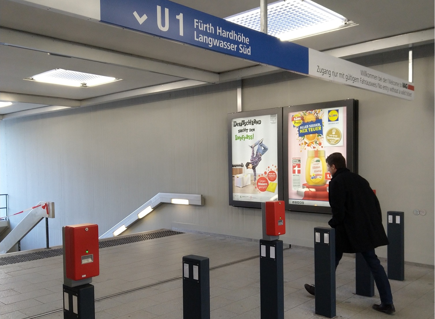 The City Light Posters at the access to the fair grounds, directly next to the ticket machine in the upper area of the underground station, are present both on arrival and departure. This position offers maximum visibility for all trade fair guests using the underground. As the trade fair ticket also serves as a public transport ticket, these advertising spaces are noticed by almost all trade fair guests.